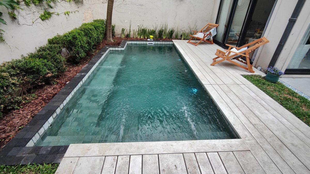 Ofrecemos una variedad de opciones para revestir tu piscina: Venecita Premium en múltiples colores, Marmolite y placas de Travertino, ideales para lograr un acabado único y duradero.